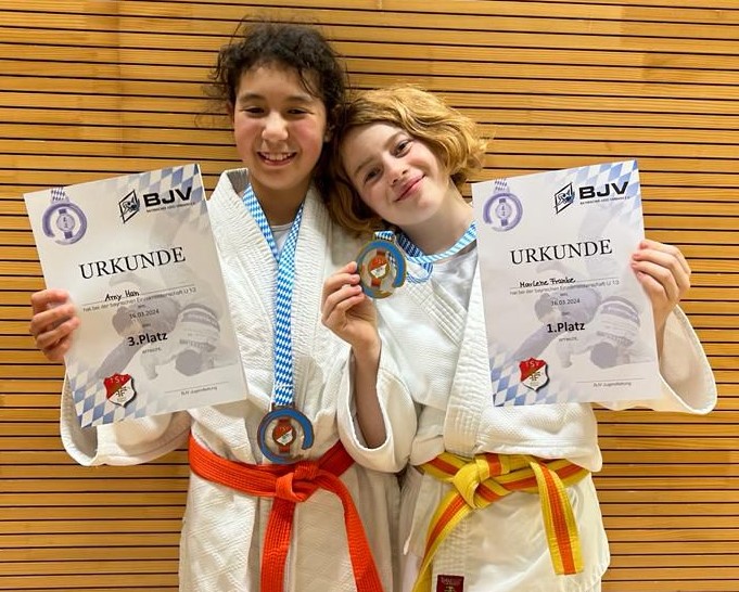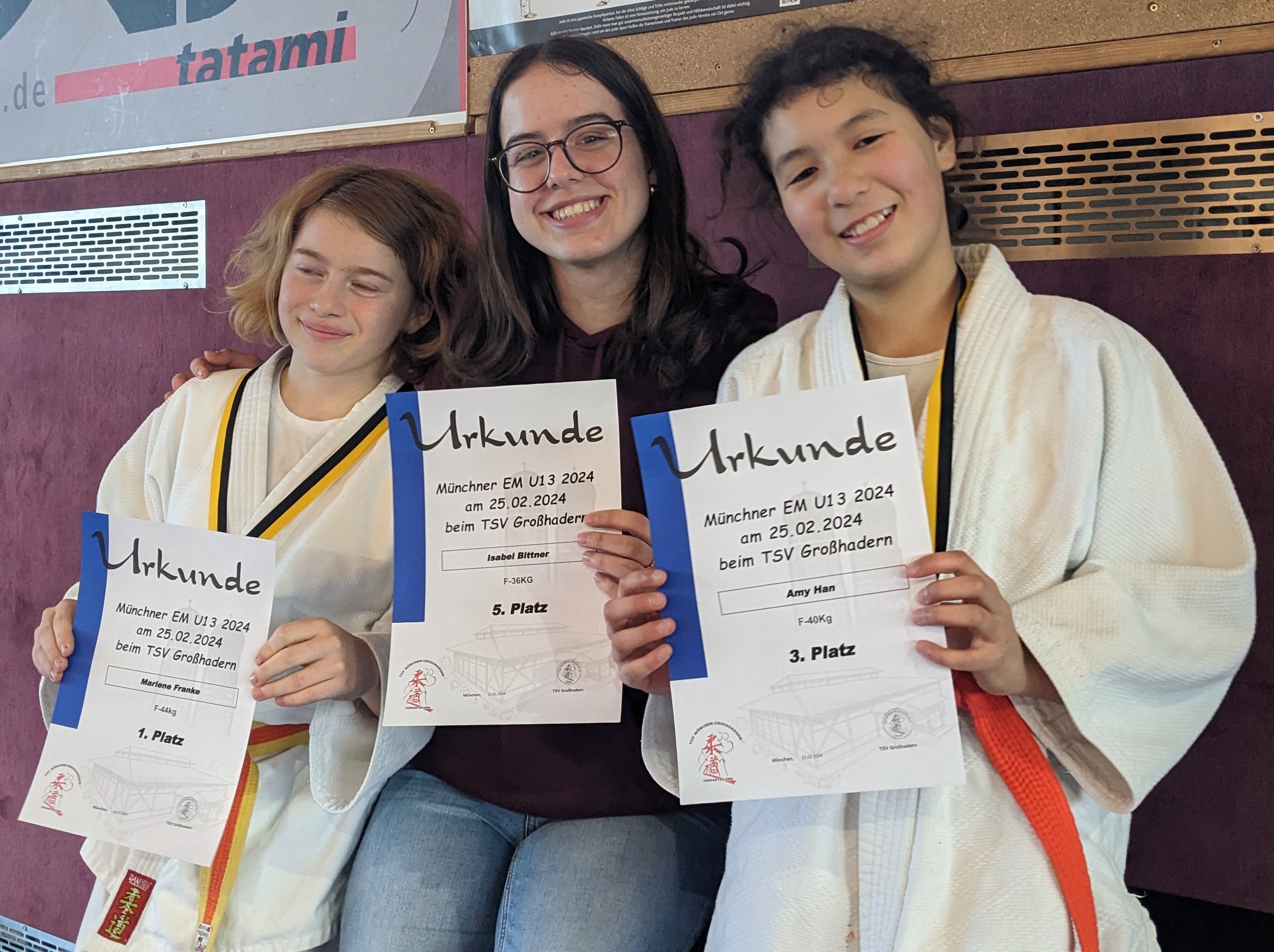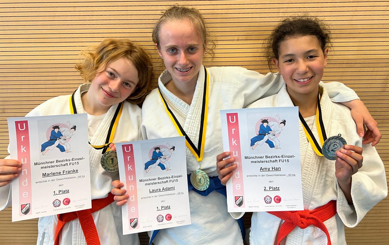 den Titel. Amy Han gewann all ihre Kämpfe mit schönem, aktivem Judo und wurde mit der Goldmedaille belohnt. Marlene Franke tat es ihr nach und sicherte sich in einem hart umkämpften Finale ebenfalls den Titel. Laura Adami musste sich nur der späteren Titelträgerin geschlagen geben und gewann die Bronzemedaille. Alle drei Mädels haben sich für die Bayerische Meisterschaft in Hof qualifiziert.