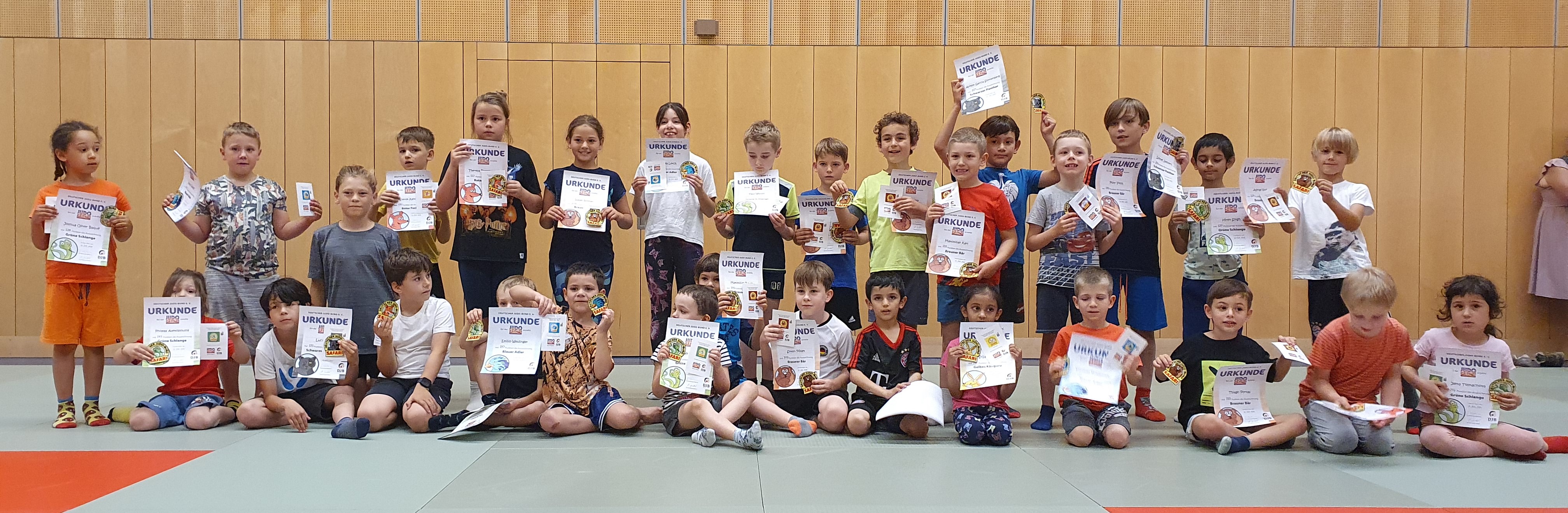 Je nach erreichter Punktzahl bekam jedes Kind einen Aufnäher mit einem Safaritier, einen Sticker für den Judopass und natürlich eine Urkunde. Unter großem Beifall wurde zweimal ein gelbes Känguruh, sechsmal der rote Fuchs, siebenmal eine grüne Schlange, fünfmal ein blauer Adler, neunmal der braune Bär und dreimal der schwarze Panther verliehen. Herzlichen Glückwunsch.