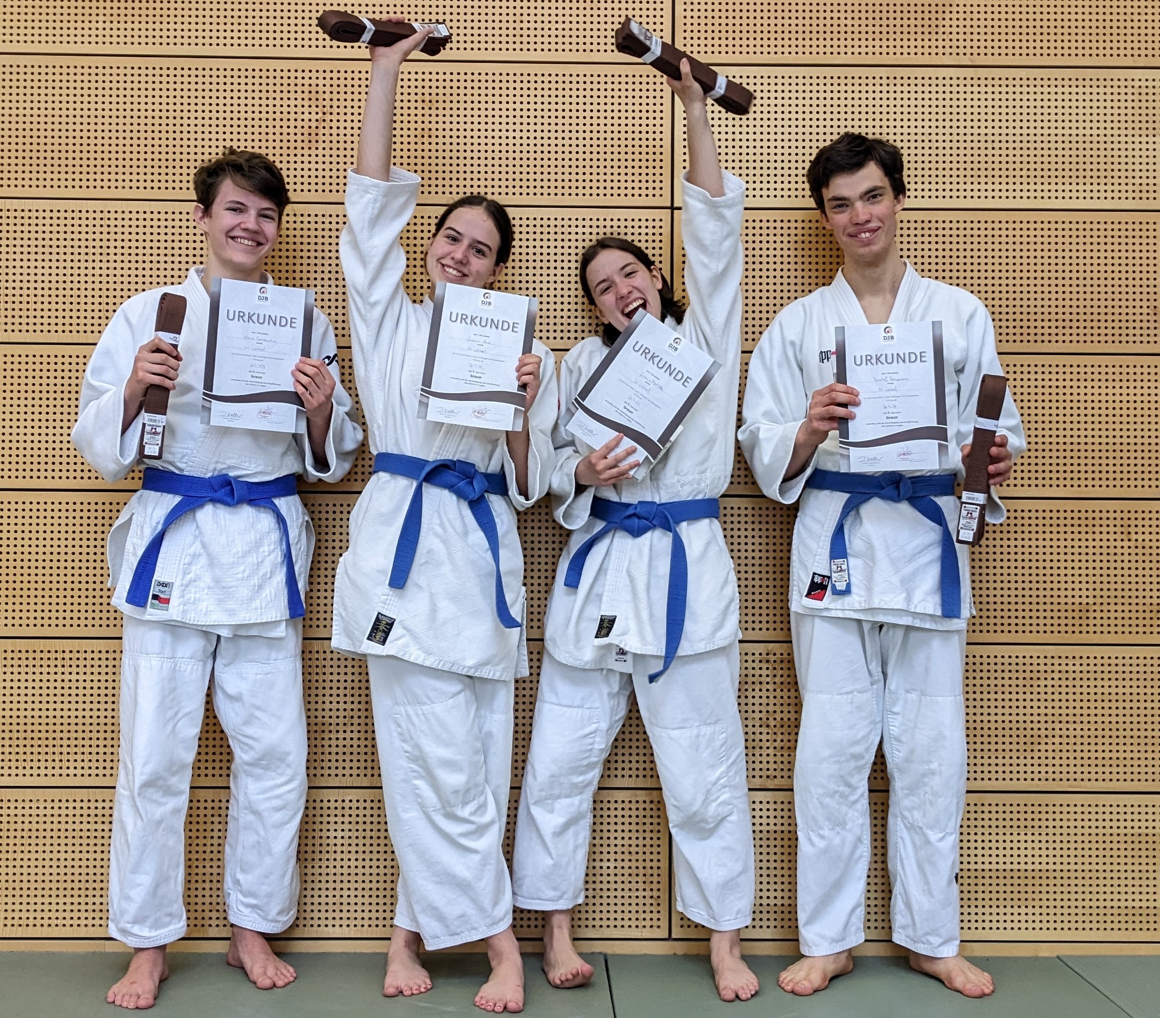 Die Kampfsportabteilung des SV Lohhof freut sich über vier neue Braungurtträger. Konstantin Sturm (v.l.), Ana und Mathilda Gracic und Benjamin Bischoff haben sich in den vergangenen Wochen intensiv auf den 1. Kyu, den höchsten Schülergrad, vorbereitet. Sie übten die vorgegebenen Stand- und Bodentechniken, Kata und Wettkampfkonzept. Bei einem abschließenden Lehrgang demonstrierten die Prüfer Ulrike und Hamid Burg noch einmal neue Varianten der bekannten Techniken. Die vier zeigten das Geübte aus Kombinationen und Finten. Aufgrund ihrer guten Leistungen stand der Graduierung nichts im Wege. Daher dürfen sie nun den braunen Gürtel tragen.