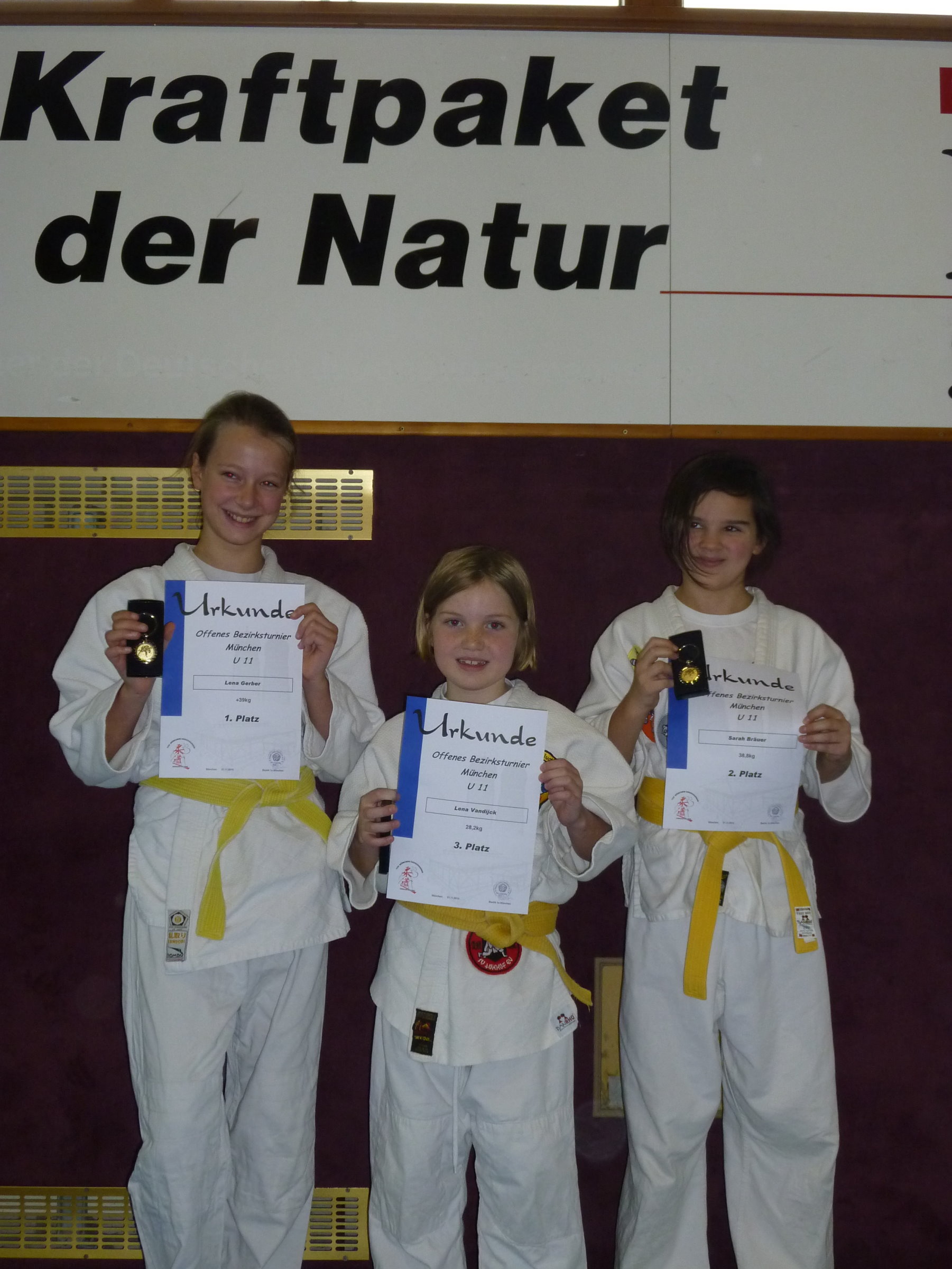 Die Mädchen waren schon die Turniererfahreneren. Sarah Bräuer und Lena Gerber mussten in einer Gruppe ran. Das direkte Duell entschied Bräuer für sich. Da beide aber gegen Paula Henze vom MTV München siegreich von der Matte gingen, wurde Sarah Bräuer Erste und Lena Gerber Zweite. Ebenfalls die Silbermedaille erhielt Angelina Härzer. Mit schönen Fußwürfen und einem effektiven Haltegriff setzte sie sich gegen Theresa Raaf vom GSC Gauting und Tamara Hauth von Kodokan München durch. Lediglich Lea Schoch vom Gastgeber Stadtwerke München war eine Nummer zu groß.